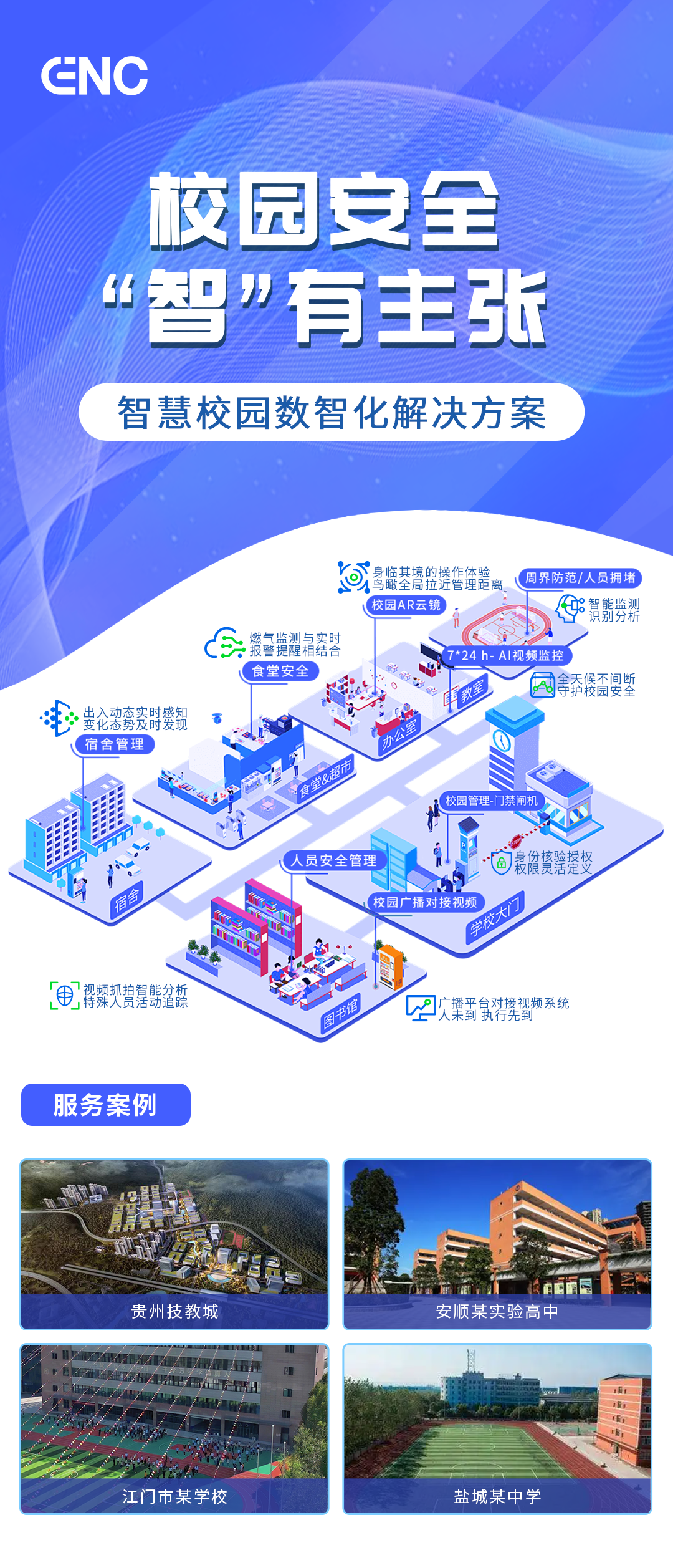 新智聚安智慧校园解决方案 通过大数据、物联网、人工智能等先进技术 实现门禁、梯控、人员、巡更、周界防范等 多场景的统一管理 构建“数据可视、风险可控、业务可管”